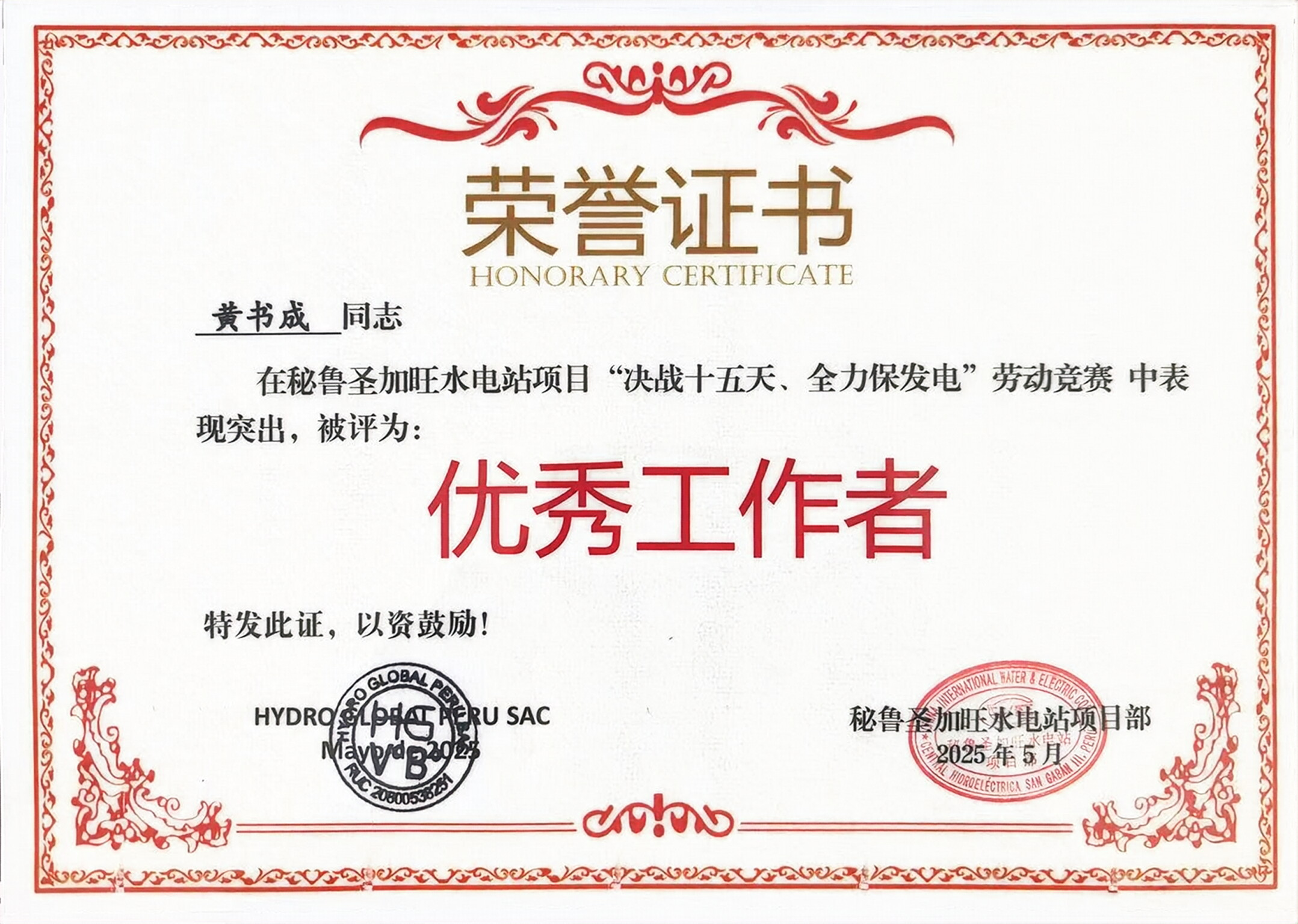 在秘鲁圣加旺水电站 “决战十五天、全力保发电” 劳动竞赛的紧张战场上,我司员工黄书成宛如一颗坚韧不拔的 “螺丝钉”,面对现场通讯设备信号微弱、数据传输卡顿严重制约项目进度的难题,他携带专业设备,在烈日的炙烤下,穿梭于电站各处逐米排查通讯线路,工装被汗水浸透又风干,却始终全神贯注,成功提升通讯系统可靠性与运行效率,为项目推进排除关键障碍;当设备突发故障成为拦路虎时,他主动请缨投身 “战斗”,在调试现场凭借扎实技术功底抽丝剥茧锁定故障根源,即便长时间高强度工作使双眼布满血丝,仍坚守岗位,成功攻克技术难题,保障通讯及安防系统稳定运行,为电站如期发电扫除障碍。他以超乎常人的毅力与精湛技术,在重重挑战中闯出胜利之路,用实际行动诠释 “钉钉子” 精神,在项目攻坚期一人扛起重任,成为电站顺利发电的坚实支柱,也正因这一系列突出表现,当之无愧荣获 “优秀工作者” 荣誉称号。