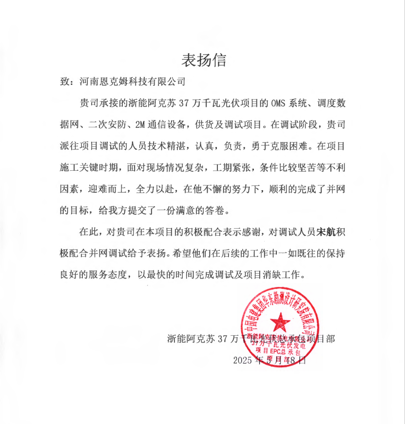 未来,随着项目规模化推进,河南恩克姆科技有限公司将继续以 “攻坚型人才” 为支点,在电力、光伏等领域续写 “技术破局 + 服务创优” 的新篇章,为行业输送更多 “能打硬仗、善解难题” 的标杆人才。