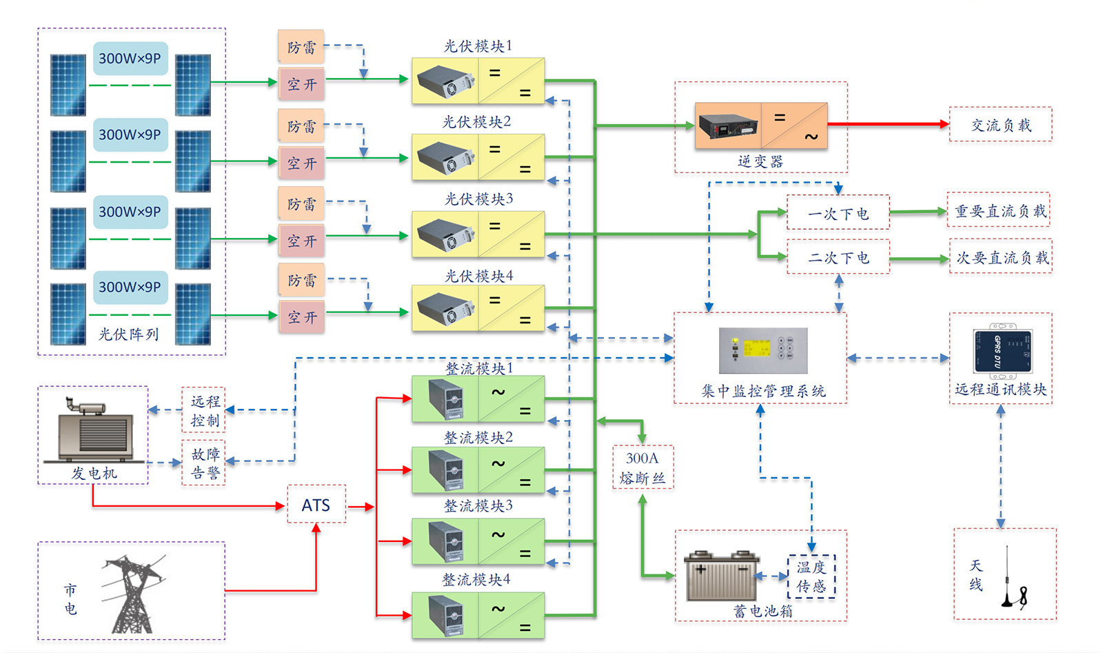 我司在综合电源系统领域经营多年,依托先进的交直流融合技术与智能管理平台,为客户提供实用的电源解决方案。产品涵盖 UPS 电源和 - 48V 通信电源,可根据不同场景需求为用户定制供电方案:例如在离网型户外场景下,通过光伏模块、储能系统、柴油发电机等不同供电模式互补,为各类负载提供稳定电力,同时配置防雷、监控等模块保障系统安全运行,拓扑图如下: